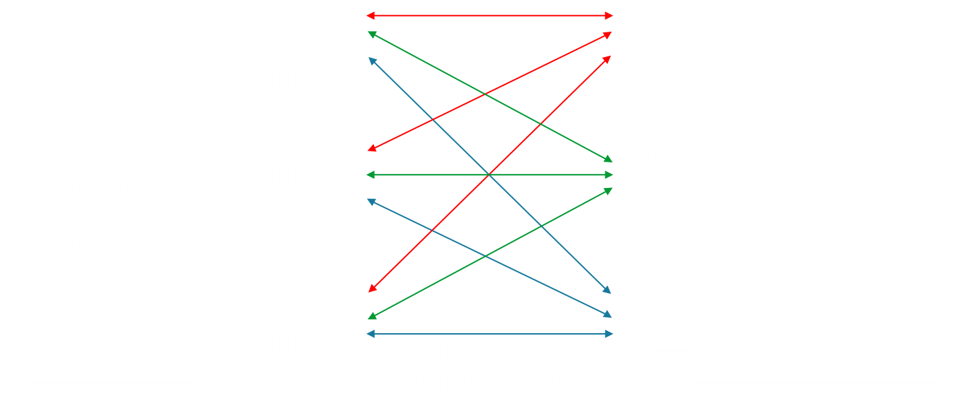 Система эмуляции спутниковой связи с ФАР имеет N+M физических каналов и N×M×2 каналов затухания для эмуляции двусторонней передаточной функции порядка N×M, H.